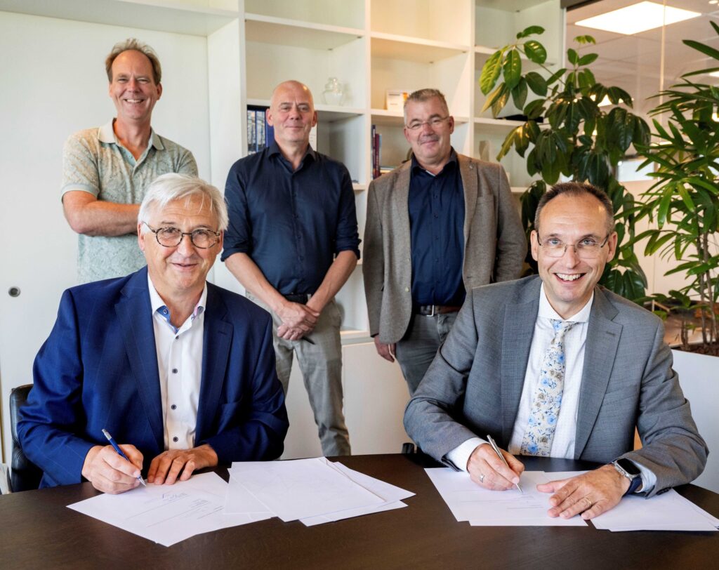 Het team betrokken bij de totstandkoming van de samenwerking, met zittend v.l.n.r.: directeur Jan Huijbers (Van den Herik-Sliedrecht) en CEO Paul Dirix (Havenbedrijf Moerdijk), en staand v.l.n.r.: uitvoerder Herman van Kampen, regiomanager Zuid-Nederland Maurice Koelmans (Van den Herik-Sliedrecht) en manager Infrastructuur en Beheer Henk Schakenraad (Havenbedrijf Moerdijk)