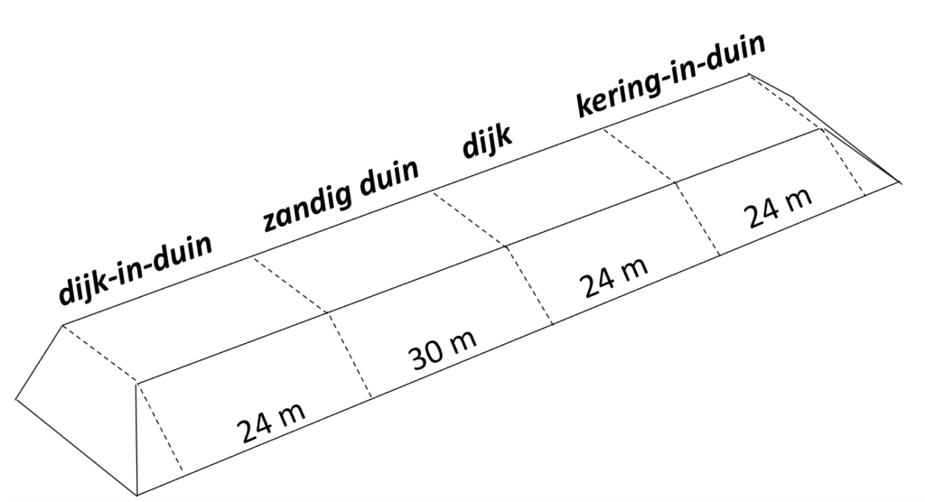 Um zu untersuchen, wie die Erosion der Testdüne und des vorderen Küstenprofils bei hybriden und regulären Dünen und Böschungen verläuft, werden vier verschiedene Typen getestet. Alle mit der Vorderseite (seewärts) und der Spitze an der gleichen Stelle, aber mit unterschiedlichen Strukturen. Um hybride Dünenstrukturen zu imitieren, werden harte Elemente in und auf der Düne platziert. Dazu verwenden wir Seecontainer und einen harten Deichhang aus Betonplatten (Stelconplatten). Diese vier Typen werden während des Experiments getestet: