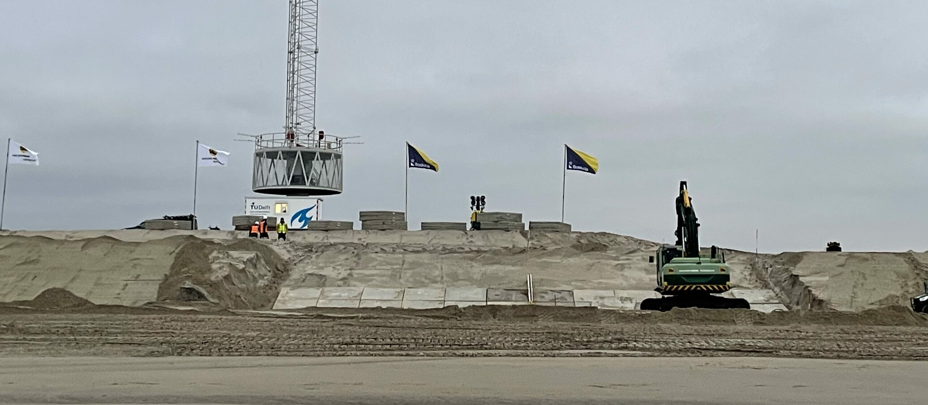 Im Auftrag der TU Delft arbeiten die Wasserbauunternehmen Van den Herik-Sliedrecht und Boskalis an der Realisierung einer etwa 100 Meter langen temporären hybriden ‚Testdüne‘, in der eine Reihe von kombinierten harten und sandigen Küstenschutzkonstruktionen simuliert werden. Dieses beeindruckende und einzigartige Feldexperiment soll zeigen, wie hybride Dünenstrukturen bei Stürmen erodieren. Es findet im Rahmen des Forschungsprogramms Future FRM Tech unter der Leitung des Postdoc-Forschers und Bauingenieurs Daan Poppema und mit Unterstützung von NWO und Rijkswaterstaat statt.