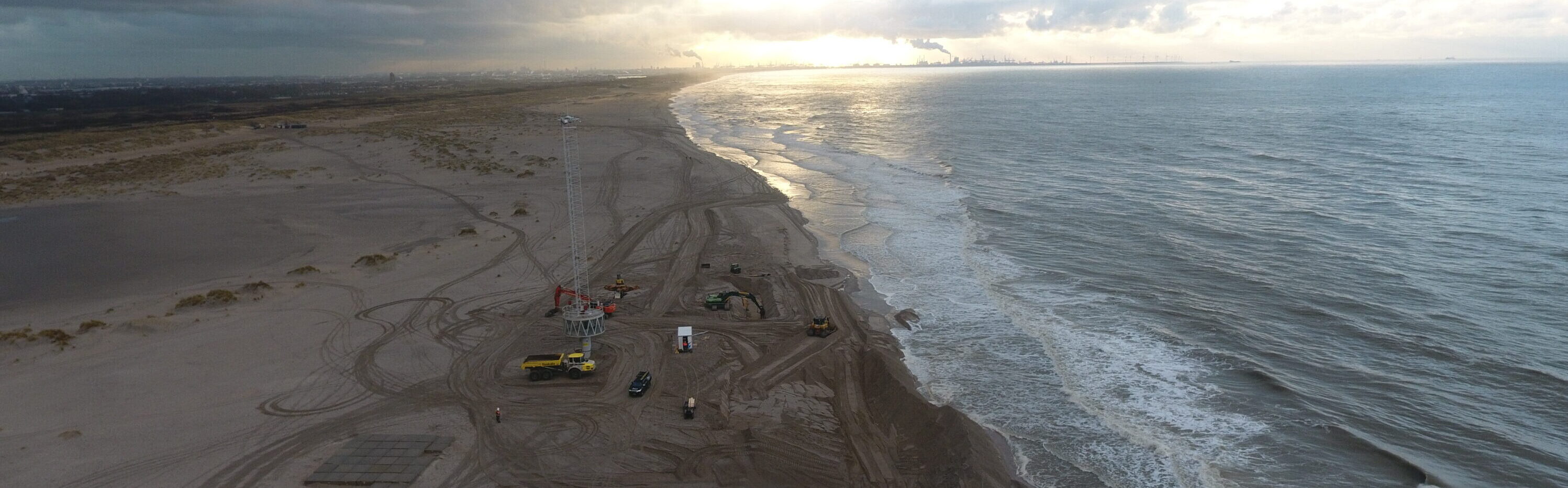 Im Auftrag der TU Delft arbeiten die Wasserbauunternehmen Van den Herik-Sliedrecht und Boskalis an der Realisierung einer etwa 100 Meter langen temporären hybriden ‚Testdüne‘, in der eine Reihe von kombinierten harten und sandigen Küstenschutzkonstruktionen simuliert werden. Dieses beeindruckende und einzigartige Feldexperiment soll zeigen, wie hybride Dünenstrukturen bei Stürmen erodieren. Es findet im Rahmen des Forschungsprogramms Future FRM Tech unter der Leitung des Postdoc-Forschers und Bauingenieurs Daan Poppema und mit Unterstützung von NWO und Rijkswaterstaat statt.
