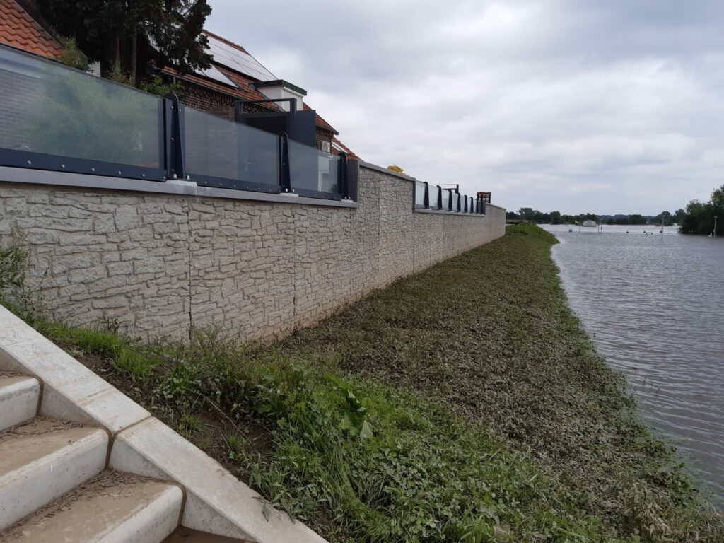 Die Glaspaneele bestehen aus mehreren Schichten aus Glas und Folie. In enger Abstimmung mit dem erfahrenen Glaslieferanten Scheuten wurden die ideale Dicke und Zusammensetzung in Bezug auf Stärke und Transparenz berechnet und festgelegt. Das Ziel war immer, den Blick auf die Maas zu bewahren und gleichzeitig die Normen für die Wassersicherheit zu erfüllen. Das verwendete Glas und die Folie sind von hoher Qualität, so dass sie auch gegen äußere Einflüsse wie das Wetter resistent sind. Die Glaspaneele wurden auf einer Gesamtlänge von 80 Metern installiert, aufgeteilt in vier Abschnitte, von denen der längste 30 Meter lang ist.