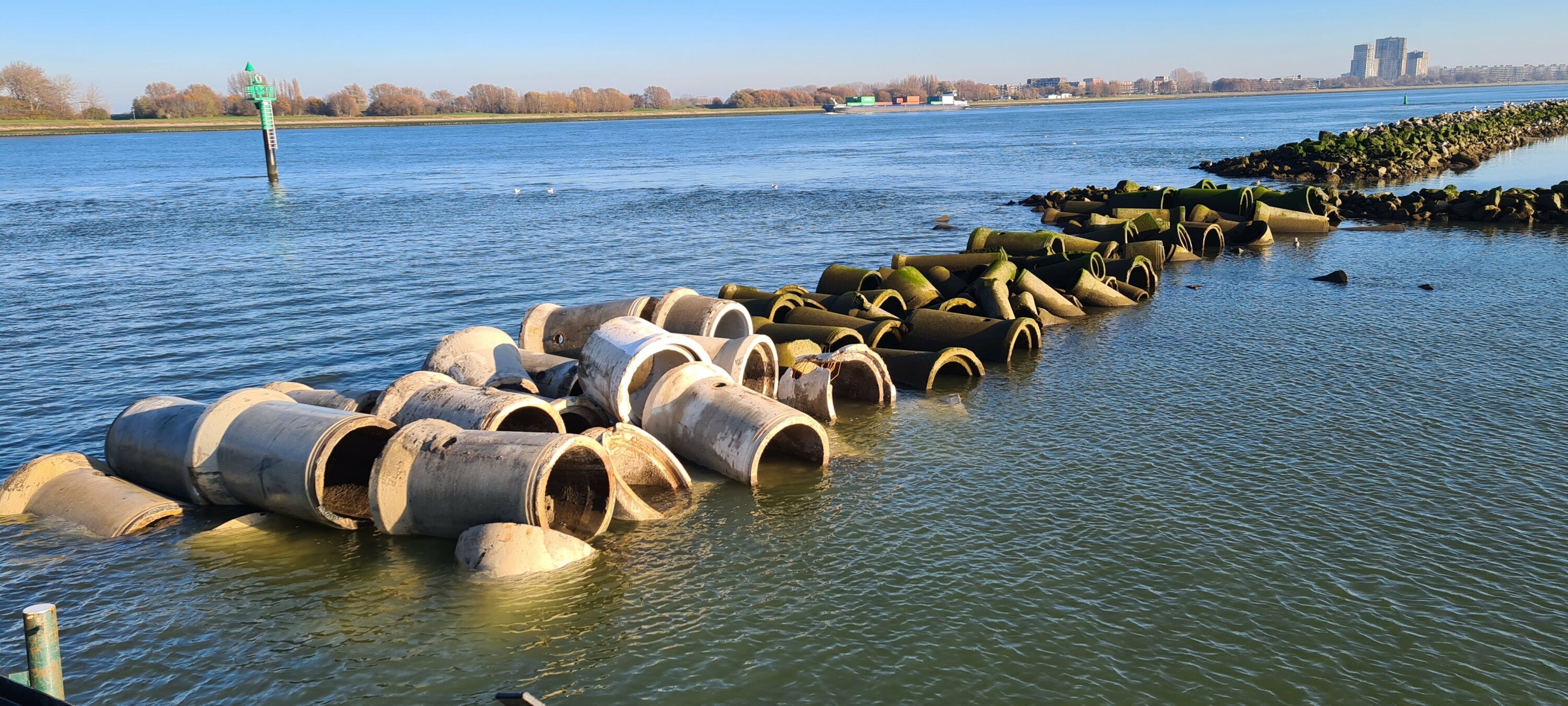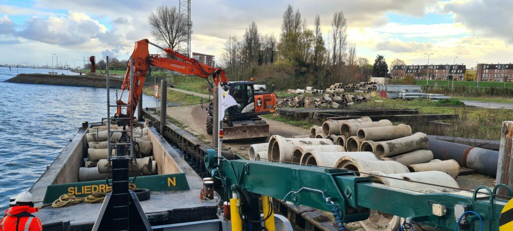 The sewer system in the city of Rotterdam is being replaced. Fortunately, all those old pipes are getting a new use. They are being used for the construction of no less than 4 km of longitudinal dams in the Nieuwe Waterweg, between the Maeslantkering and Rozenburg. A great example of circularity in hydraulic engineering!