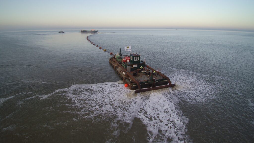 Op zee beschermen we kabels en leidingen door ze af te dekken met een beschermende laag. Op de Waddenzee gebeurt dit meestal met zand en klei. In andere gebieden passen we daarnaast stortsteen of betonblokkenmatten toe voor extra bescherming. Onze hoppers storten het zand via de bodemdeuren nauwkeurig over het tracé van de kabel of leiding. Ook voeren we regelmatig backfilling uit. Daarbij vullen we ontstane kuilen of sleuven zeer precies op door zand met de zuigbuis van onze baggerschepen terug te storten op de juiste locatie.